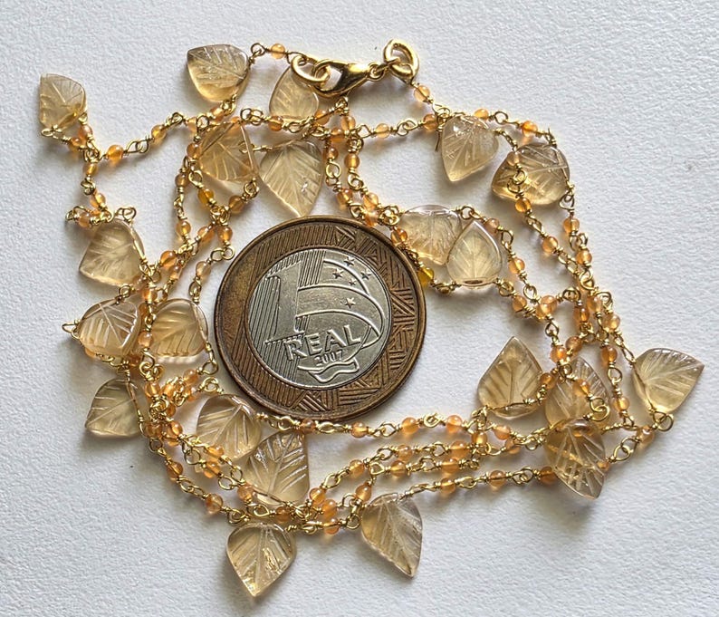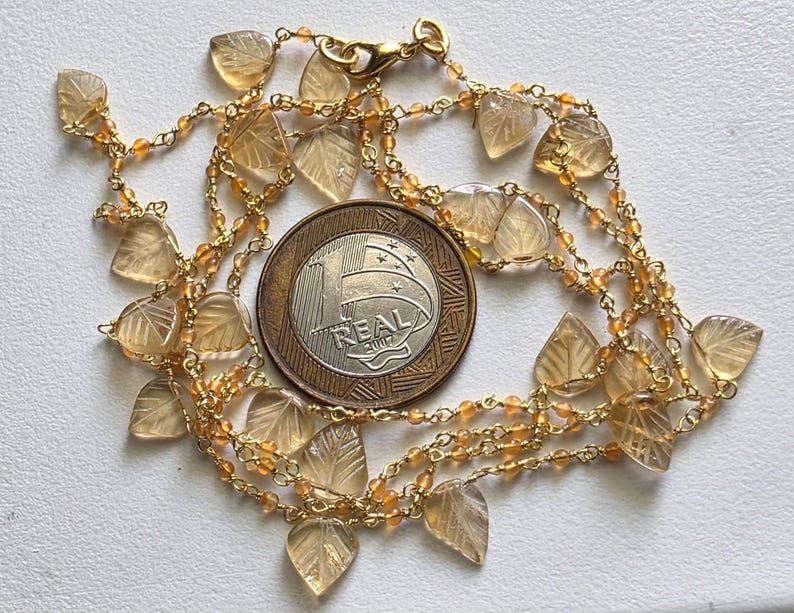 Citrine Faceted Rondelle 2mm & Leaf Carving 8-11mm Wire Wrapped Beaded Rosary Chain 925 Silver Gold Polish Citrine Rosary Chain Necklace