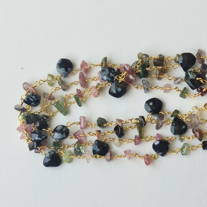 Snow Flake Obsidian Faceted Heart 7mm & Multi tourmaline Rough 4-6mm Wire Wrapped Beaded Rosary Chain 925 Silver - PSG378