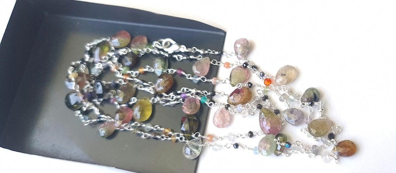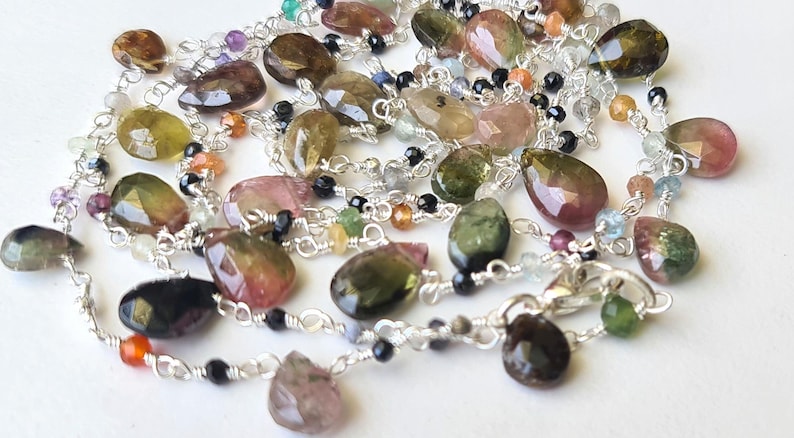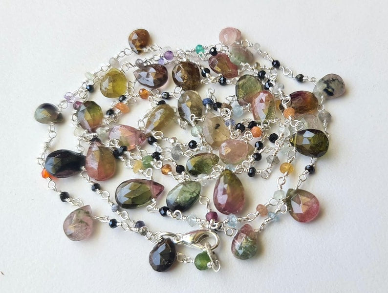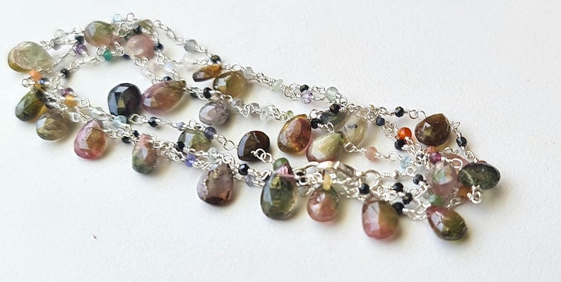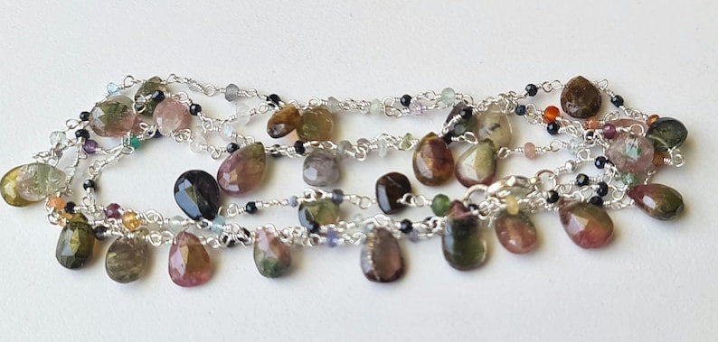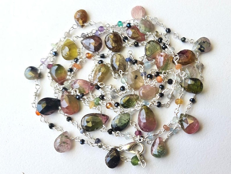 Gemstone: Multi Tourmaline Faceted Rondelle & Pear Rosary Chain 925 Silver